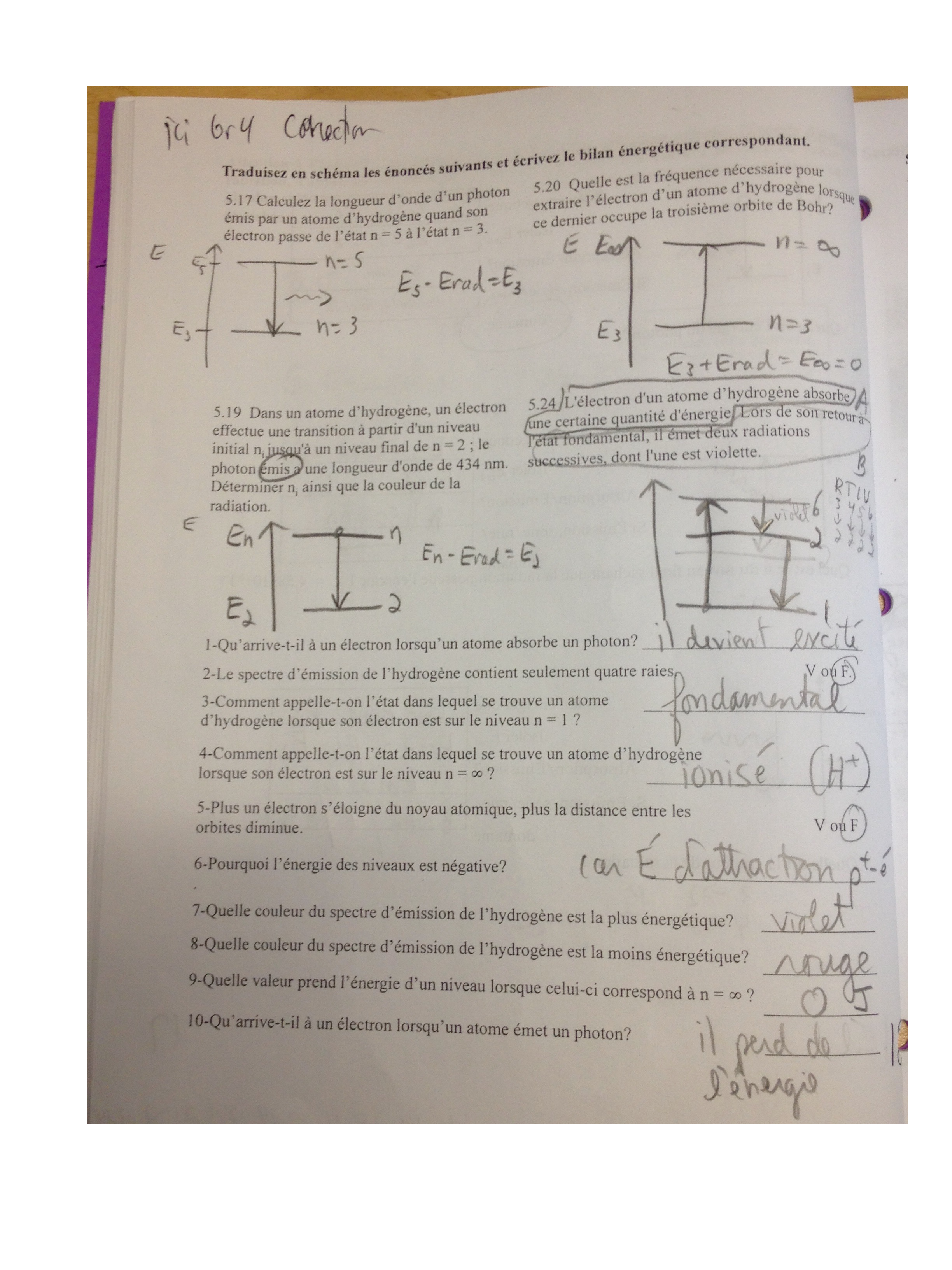 Page 19 : Soit l’électron d’un atome d’hydrogène qui décrit initialement la 5e orbite de Bohr. Cet électron émet alors une radiation (un photon) de fréquence 6,9 x 1014 Hz. Solutions aux questions suivantes